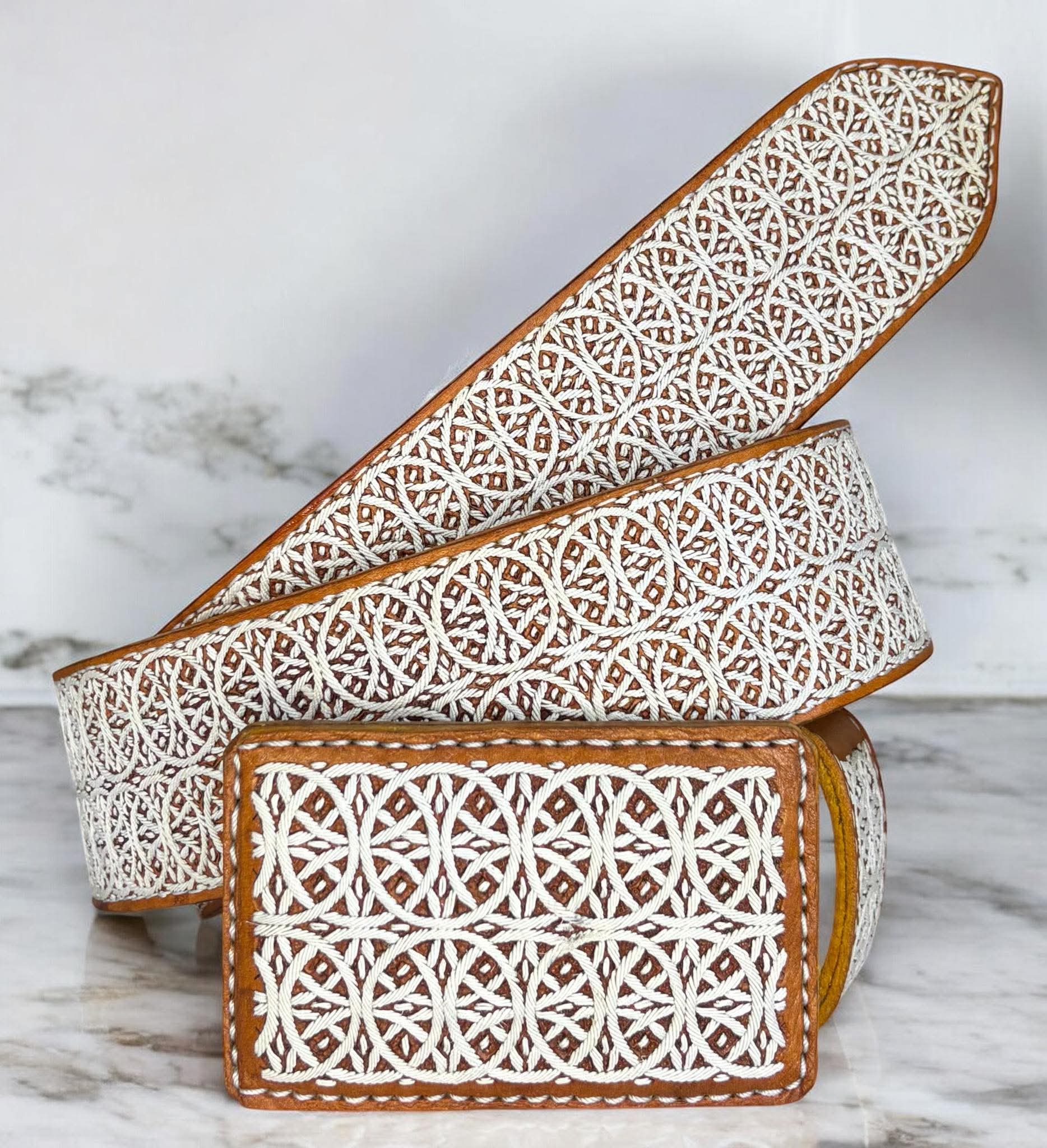 Cinturón de 2" en cuero genuino de res, bordado con pita fina original de maguey.